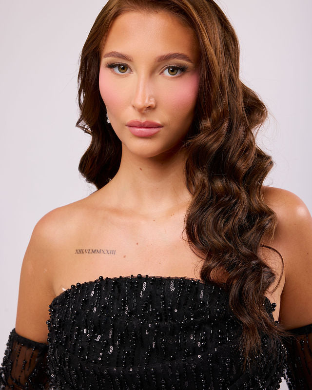 Embrace high-octane glamour with this spectacular black evening gown that radiates sophisticated drama. Designed to make a powerful statement, the dress features a flattering strapless neckline and a sleek, fitted silhouette that flows into a gentle mermaid shape. The entirety of the gown is a masterpiece of texture, fully embellished with intricate black beading and sequins that catch the light like a constellation of stars.