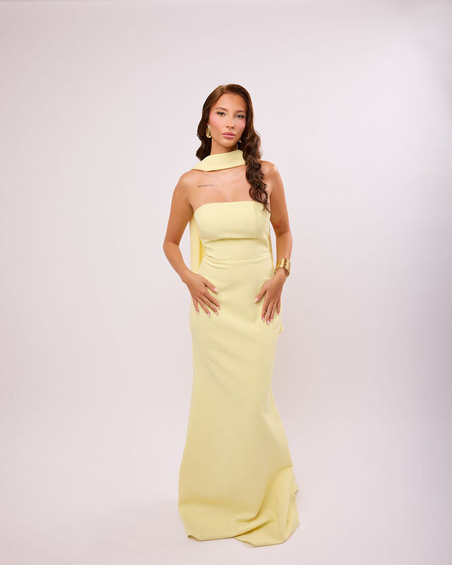 Crafted in a soft, dreamy pastel yellow (or light lemon), the gown is made from a structured yet smooth fabric that maintains its shape and offers a seamless, figure-skimming fit. The main feature is the strapless, straight-across neckline, designed for a sleek and classic profile.